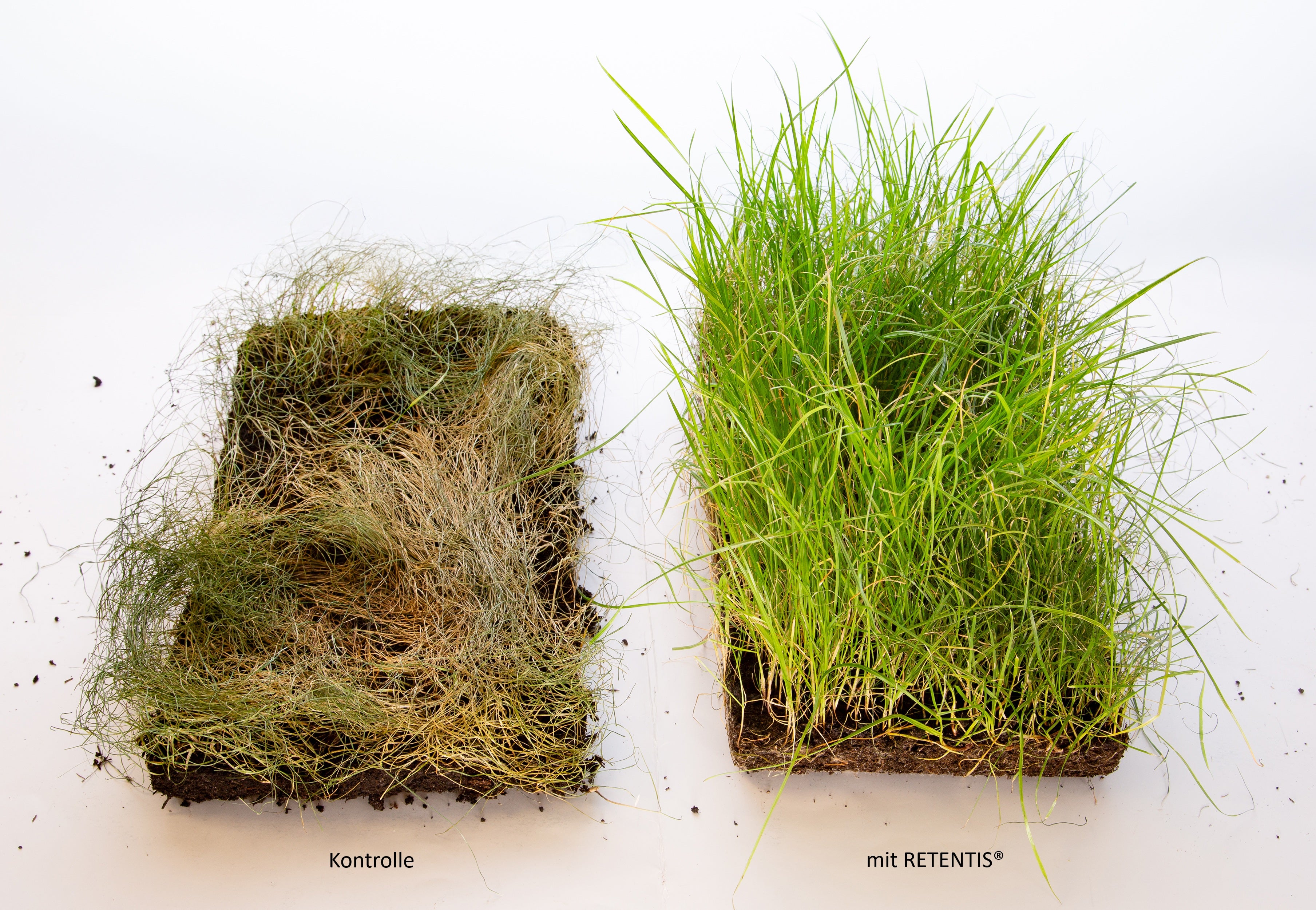 On the left, the untreated control shows clear signs of drought stress; on the right, the lawn treated with RETENTIS®. Thanks to the soil’s high water-retention capacity, the RETENTIS® lawn remains noticeably more vigorous and greener.